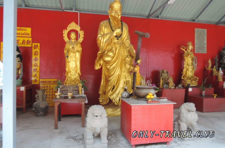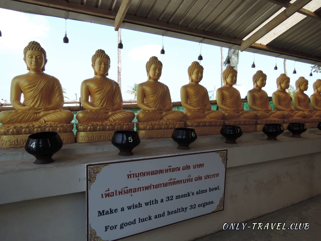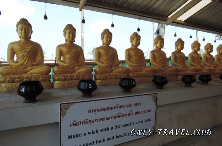 Когда налюбуетесь красотой острова спускайтесь по лестнице вниз, где будут небольшие торговые ряды с сувенирами. Ещё там есть золотистые листочки, которые продают по 100 бат, на них можно написать пожелание или просто оставить своё имя и дату, повесив их на определённых местах, загадать желание. Также можно повязать ниточку на руку на удачу, делает это монах, всё на добровольных началах, но как правило все кто идёт повязывать, кладут по 20 бат. Там же есть 32 статуи Будды, возле которых стоят чаши и туда нужно бросить по монетке в каждую, при этом загадать желание.