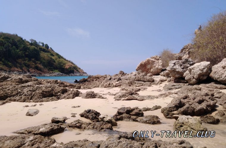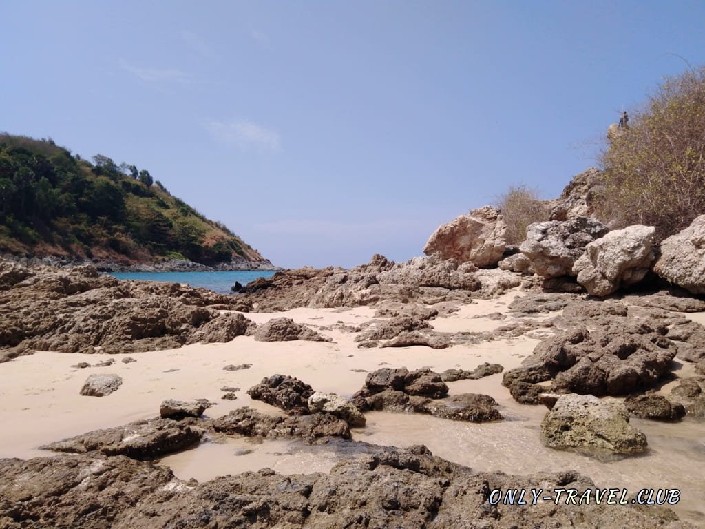 Пляж разделён условно пополам каменистым выступом в море, на который можно подняться и сделать чудесные снимки. Но подниматься лучше в обуви, так как острые камни на этом выступе.