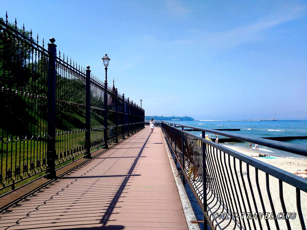 Вдоль всего побережья в Пионерском есть спуски и подъёмы к морю, где-то это лестница, а где-то придётся спускаться по песку. Не так давно в Пионерском обновили променад, который теперь подсвечивается в тёмное время суток, а ещё на нём можно осуществлять пробежки и кататься на велосипеде.