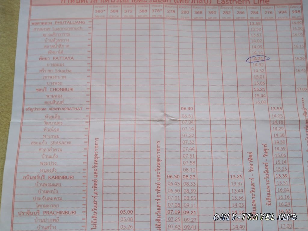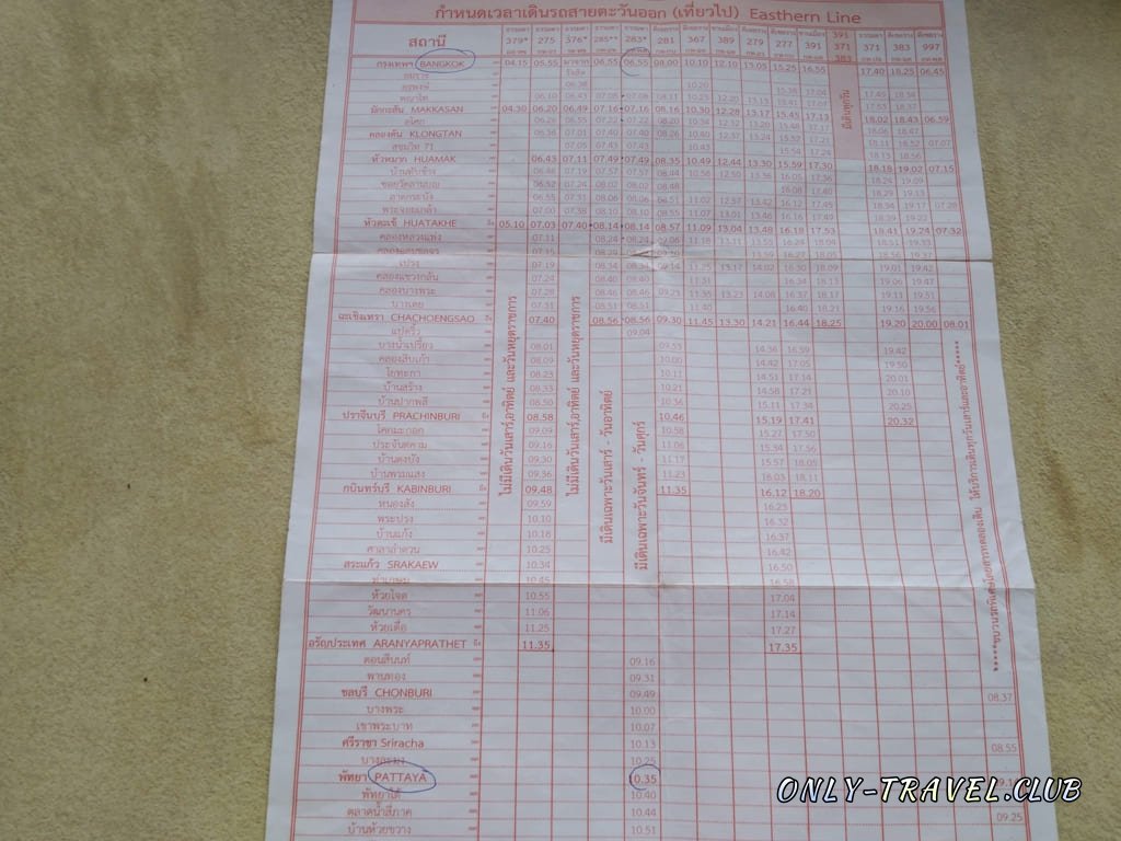 Поезд со станции Хуа Лампонг (Hua Lamphong) отходит один раз в день в 6-55 утра и приходит в Паттайю в 10-35 утра, соответственно время в пути составляет 3 часа 40 минут. Поезд выезжает ровно в то время которое указано, задержек нет. Но вот в конечный пункт своего следования может прибыть не вовремя, иногда бывают небольшие задержки, но не больше получаса. Также есть обратный поезд из Паттайи в Бангкок, он отправляется в 14-21 дня и прибывает в 18-15 вечера. Оба поезда идут один раз в день, поэтому кто пропустит указанное время, в этот же день на поезде не уедет.