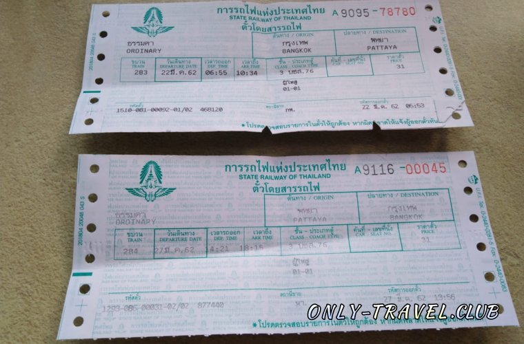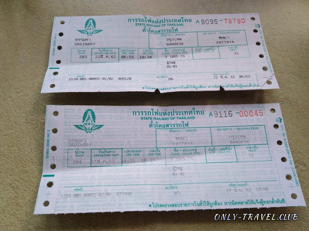 Проезд в этом направлении достаточно бюджетный и я с уверенностью могу заявить, что дешевле способа добраться не существует. Ну только если не автостоп, но к такому способу готов не каждый путешественник. Стоимость проезда 31 бат (1$) за вагон без кондиционера 3-й класс и это очень дёшево за 3 часа 40 минут езды без пробок, в достаточно приличном транспорте. Также существует 2-й класс за 72 бата (2.35$) и 1-й класс за 140 бат (4.50$). Касса в Паттайе начинает продавать билеты за полчаса до прибытия поезда, а в Бангкоке можно покупать билеты заранее. Билет не выбрасывайте, когда поезд тронется с места контролёры ходят и проверяют билеты, делают прокол, но билет сохраняйте, могут ещё раз посмотреть.ДРУГИЕ СПОСОБЫ: