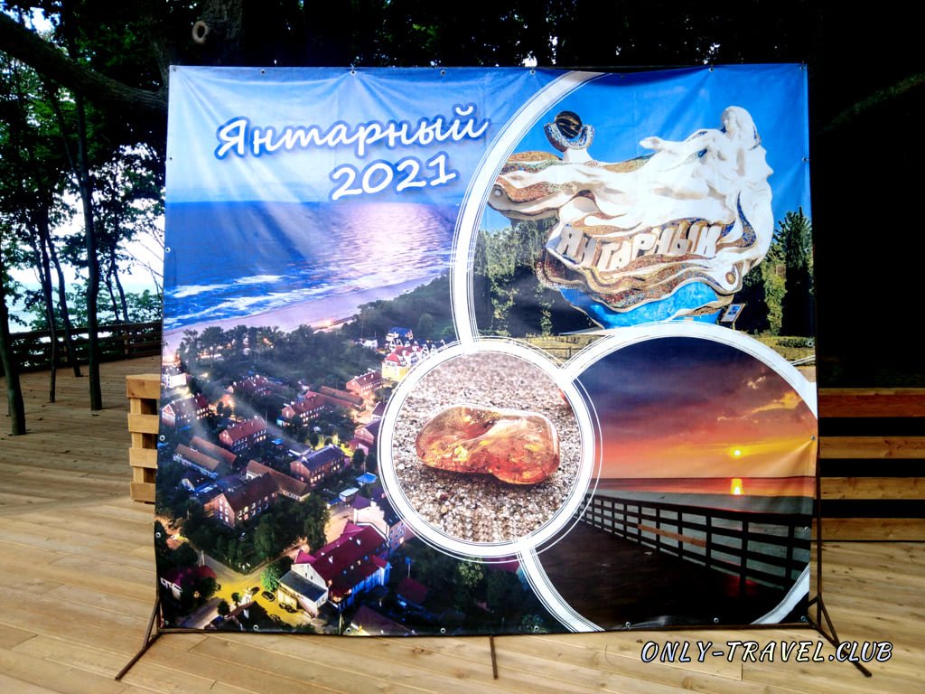 На пляж и море в посёлке Янтарный можно полюбоваться с эко-площадки, которая находится в парке прямо на склоне. Здесь совсем недавно установили качели и скамейки с козырьками, поэтому даже в непогоду можно дышать здесь полезным воздухом.