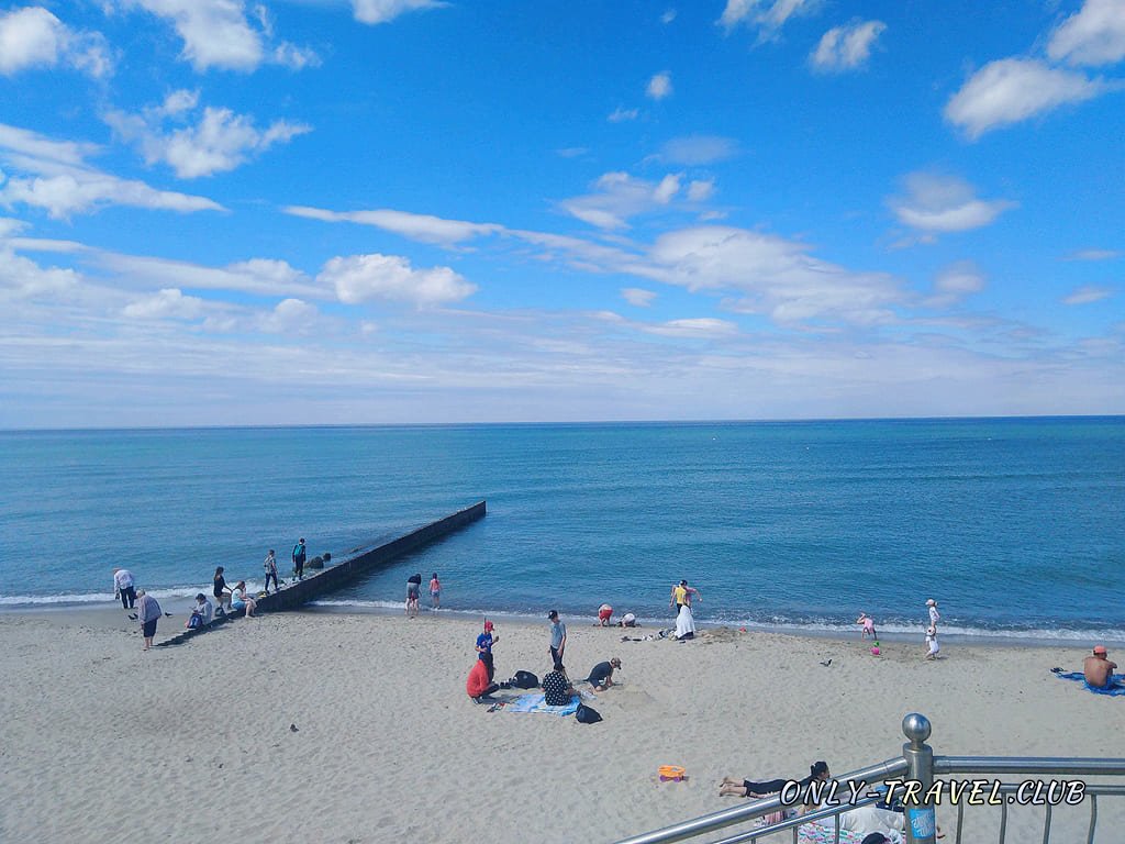 Основное скопление людей на пляже считается там, где спуск с центра города, оно и понятно, так как все отели и санатории расположены практически в центре, а некоторые даже с видом на море и побережье. Если пройти левее по береговой линии, тогда дальше пляж будет шире и соответственно людей будет меньше, смело можно расположиться на песочке и не думать что кто-то рядышком приляжет, буквально в метре.